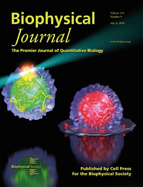 The cover for the May 8 issue of the Biophysical Journal is an artistic rendering of how surfaces can influence membrane protein dynamics in lymphocytes. A red T cell interacts with the surface and spreads out due to adhesion. A green T cell is suspended in an agarose hydrogel that allows the cell to retain its natural shape. The difference between these cells is visualized using reflection to indicate that the green cell is floating. For both cells, real tracking data is rendered as thick glowing lines. The red tracks on the adhered cells are immobile due to the interaction with the surface, while the green tracks on the suspended cell undergo free diffusion. The light sheet, which is used to image these dynamics, is also depicted by a cyan glow. Where it overlaps one of the green tracks, fluorescence is portrayed by the emission of a yellow glow. The membranes of the cells were created with displacement mapping using T cell electron microscopy data and the final image was rendered in SolidWorks.