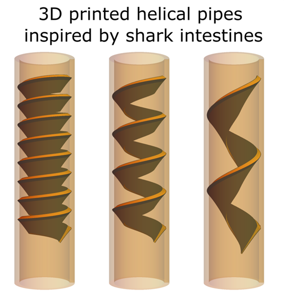 Different kinds of sharks have intestines with different spiral patterns that favor fluid flow in one direction. Ido Levin and colleagues are recreating those shapes using a 3D printer in order to study the unique fluid flow inside the spirals. Image courtesy of Ido Levin.