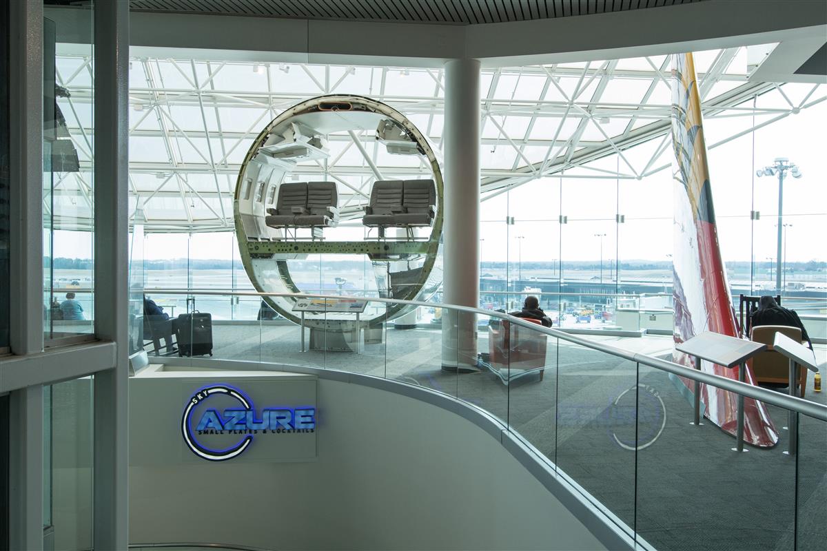 I walked the length of the terminal (outside security) looking for my perfect work spot. Starbucks? Maybe, but what else? It had been years since I last flew into BWI so I asked the United Airlines ticket agent for a recommendation. After a discussion with a colleague, she recommended "Duclaw Brewing Company." On my way to the brewing company, I noticed a sign that read, "Sky Azure Small Bites and Cocktails" with an arrow pointing up. I looked up and saw a sliced section of an airplane with two seats suspended in mid-air. Intrigued, I took the elevator up.