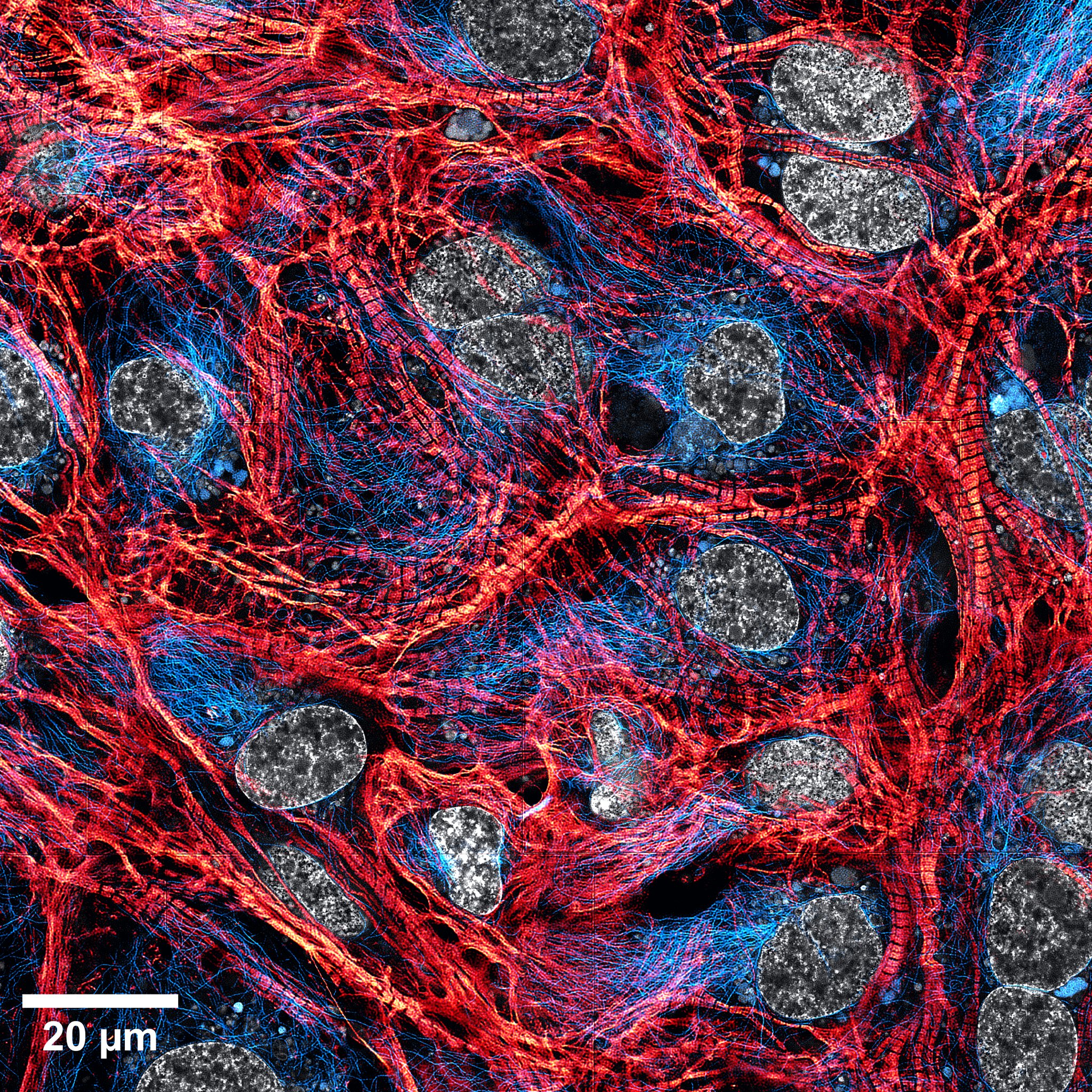 One of the first things that jumps out at you in this image is how crisp the microtubules and sarcomeres are and that they are seemingly connected despite belonging to different cells. This is where we got the inspiration for the title “Connected Through Our Heartstrings”. It is particularly incredible that these structures belong to more than a dozen different cells in this image and yet appear to form a continuous network. If we added a membrane marker, the division between cells would be discreet and clear, however when visualizing the cytoskeleton of these cardiomyocytes there are no apparent divisions. This mechanical connectivity is the very basis by which cardiomyocytes synchronize their contractile function which is essential to the performance of the heart. This image is incredible to me because even though these are immature cardiomyocytes, their randomly oriented contractile network appears unbroken.